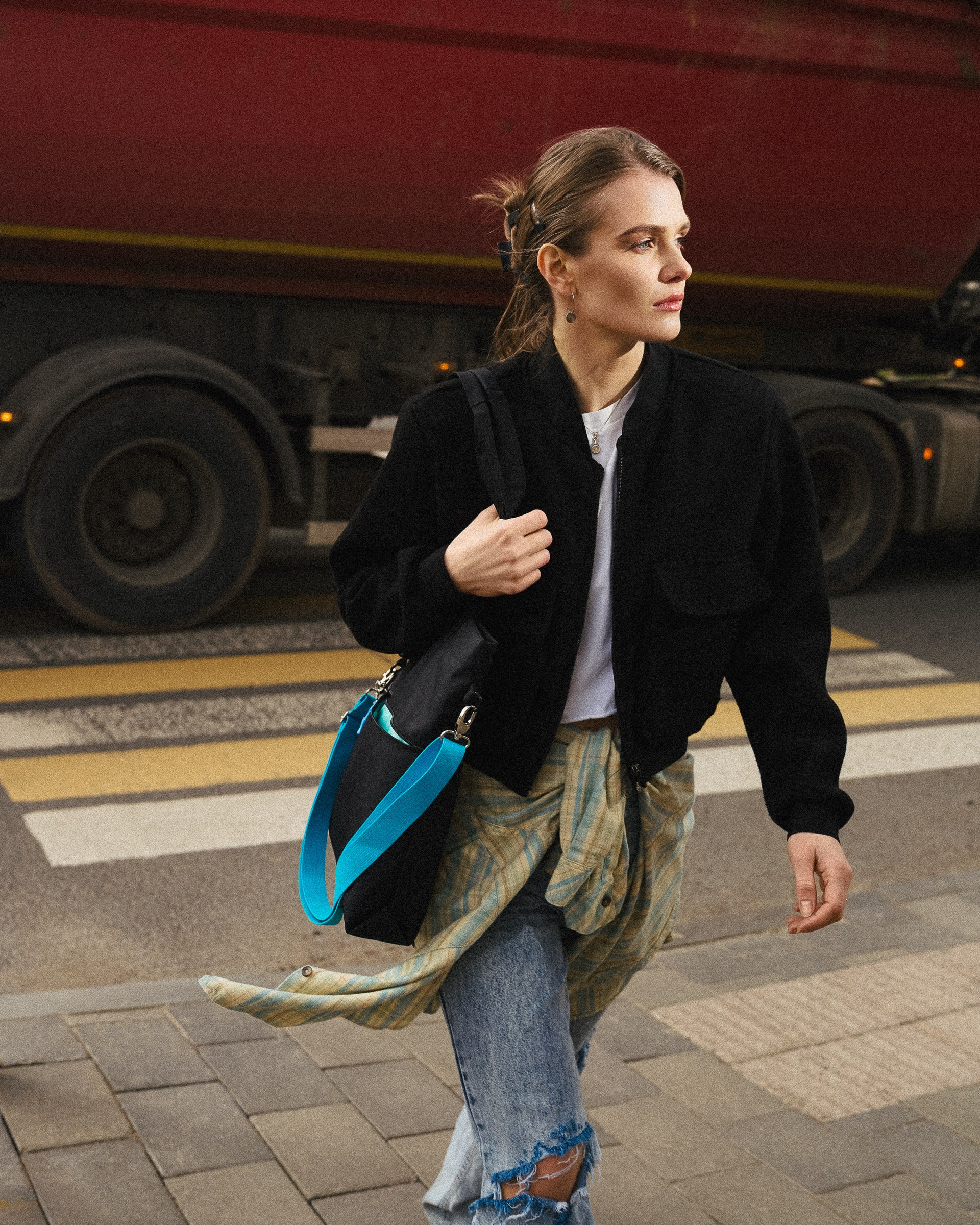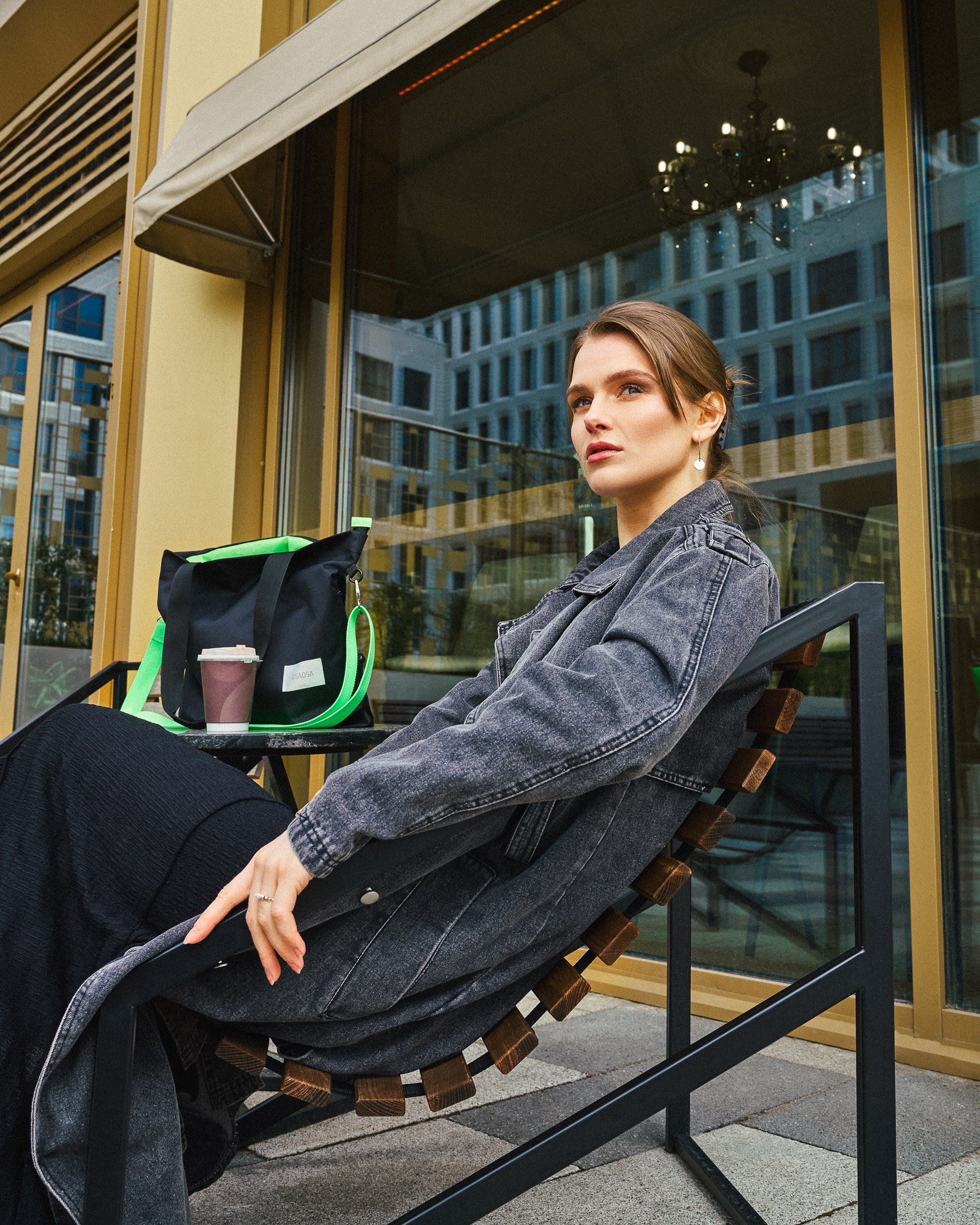 Мы работали в дневном свете, используя естественные контрасты и отражения фасадов. В кадре — не модель, а человек в городе, между делом, в движении. Это подчёркивает утилитарность и при этом индивидуальность продукта.