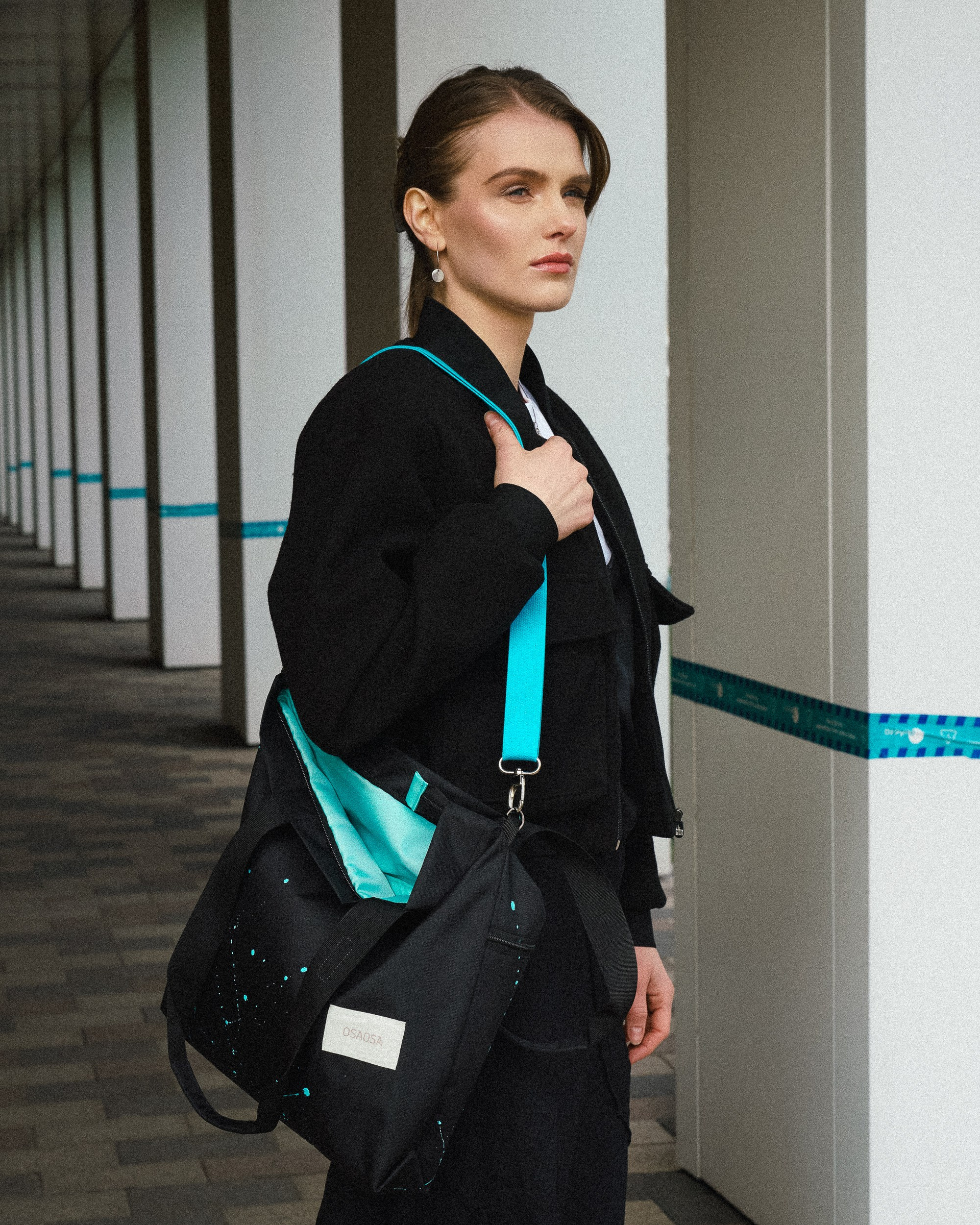 Главная задача — показать продукт не в абстрактной студии, а в живом городском контексте: как сумки выглядят в движении, на фоне современной архитектуры, в естественном освещении. Визуальный язык серии строится на сочетании структурных линий зданий, нейтральных фактур и акцентных цветов ремней — зелёного и бирюзового.